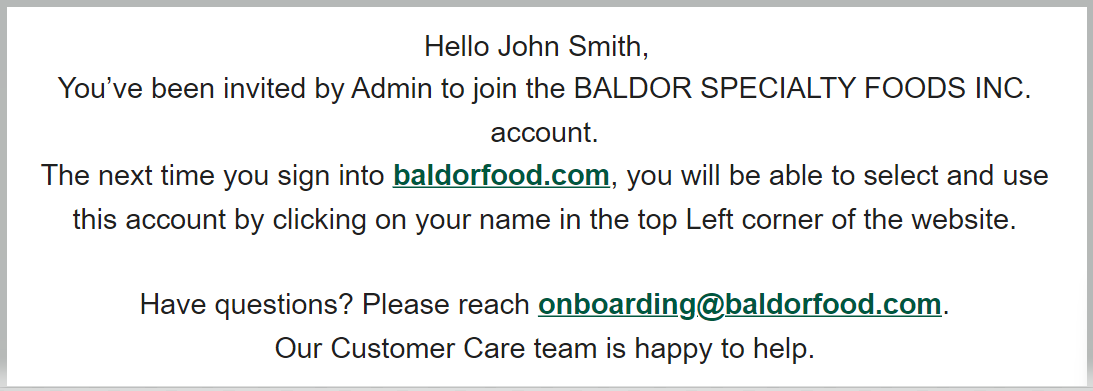 - If the user you are adding to your account already has a user profile with Baldor, the new account user will receive an email invitation titled "Hi! You've Been Added To Another Baldor Account" with the content below.