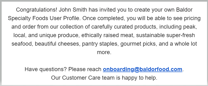 - If the user you are adding to your account does not already have a user profile with Baldor, the new account user will receive an email invitation titled "An Invitation to Create a Baldor Profile" with the content below.